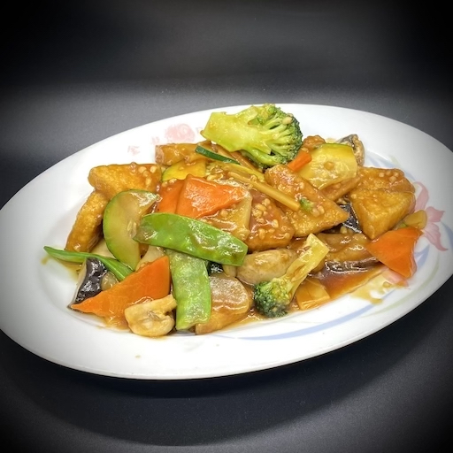 Deep fried tofu sautéed with broccoli, mushrooms, bamboo shoots, water chestnuts, snow peas, carrots, and black mushrooms in a brown sauce.