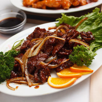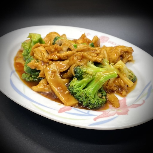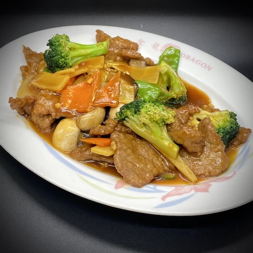 Slices of tender beef delicately cooked with mushrooms, snow peas, bamboo shoots, carrots, water chestnuts, zucchini, and broccoli in a brown sauce.