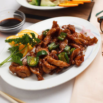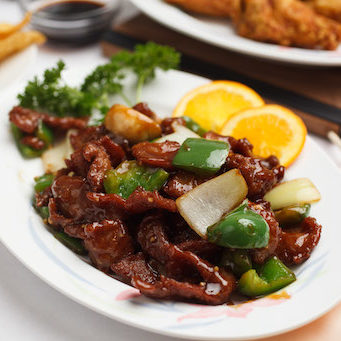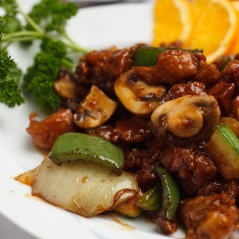 Slices of tender beef sautéed with bell peppers, onions, bamboo shoots, and mushrooms in a thick brown sauce.