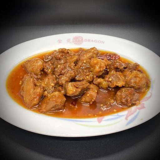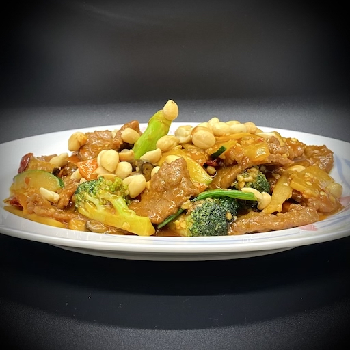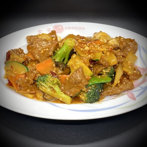 Slices of tender beef sautéed with red dry chili peppers, bamboo shoots, water chestnuts, mushrooms, bell peppers, onion, snow peas, zucchini, and peanuts in a  hots spicy sauce.