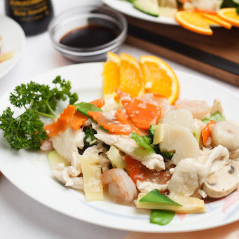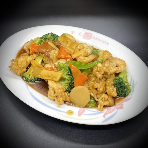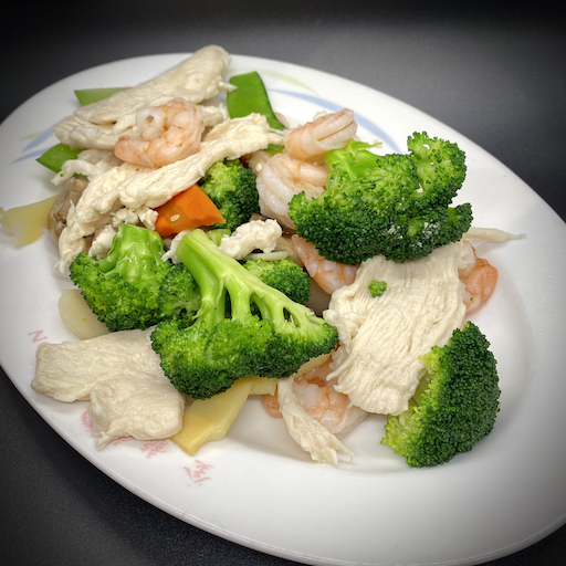 Fresh shrimp, slices of chicken breast, and slices of tender beef sautéed with snow peas, carrots, bamboo shoots, water chestnuts, zucchini, and broccoli in a brown sauce.