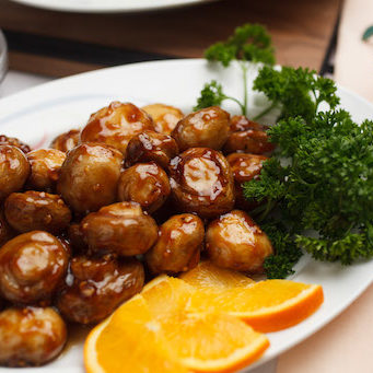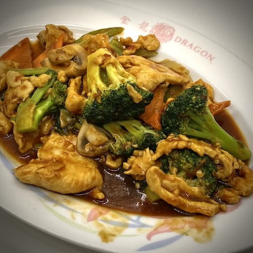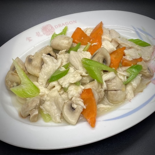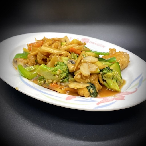 Slices of snow white chicken breast delicately cooked with mushrooms, snow peas, bamboo shoots, carrots, water chestnuts, zucchini, and broccoli in a brown sauce.