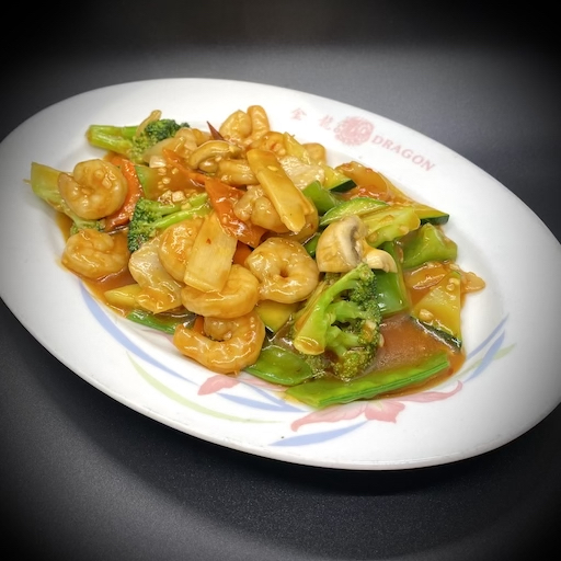 Fresh shrimp sautéed with red dry chili peppers, bamboo shoots, water chestnuts, zucchini, and mushrooms in a hot spicy brown sauce.