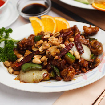 Tender diced chicken sautéed with red dry chili peppers, celery, mushrooms, bell peppers, onion, snow peas, zucchini, and peanuts in a hot spicy sauce.