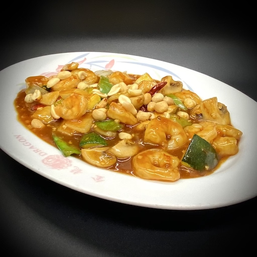 Fresh shrimp sautéed with red dry chili peppers, celery, mushrooms, bell peppers, onions, snow peas, zucchini, and peanuts in a hot, spicy sauce.
