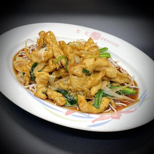 NO MSG. Slices of chicken breast sautéed with green onions, white onions, and garnished with rice noodles.