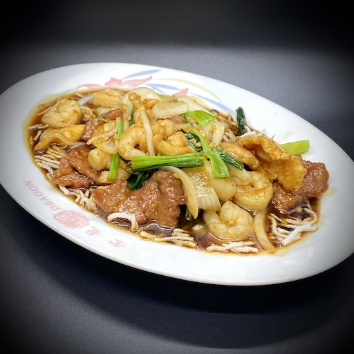 No MSG. Fresh shrimp, thin slices of tender beef, and slices of chicken breast sautéed with green onions, white onions, and garnished with rice noodles.