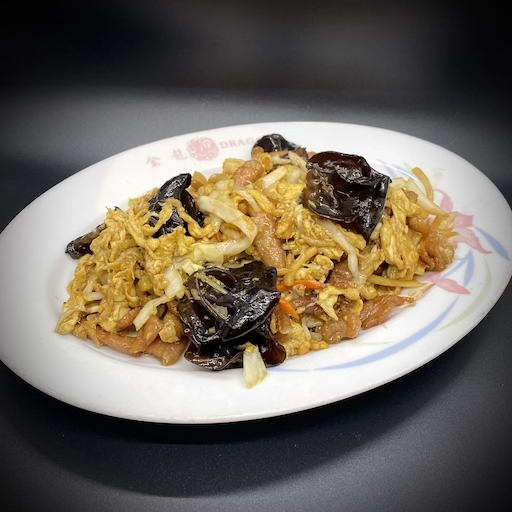 Shredded pork, fancy-flavored eggs, shredded cabbage, and Chinese vegetables are stir fried together. The dish is served with Hoisin sauce and thin Chinese pancakes.