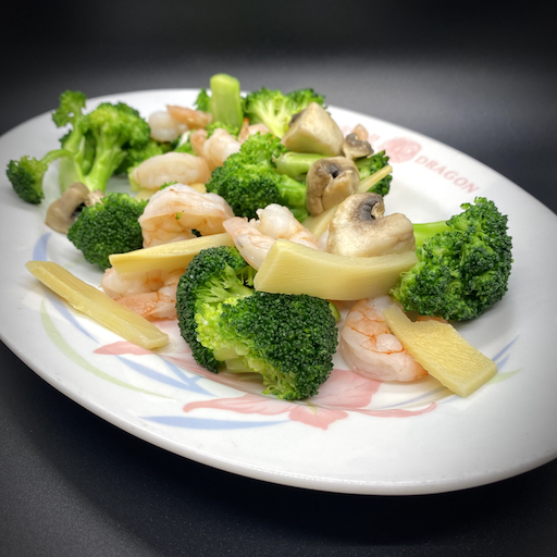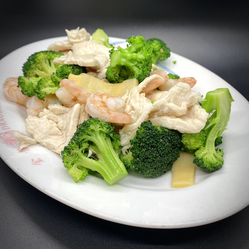 LOW FAT DISH. Slices of snow white chicken breast (Phoenix) and fresh shrimp (Dragon) delicately cooked with mushrooms, snow peas, bamboo shoots, carrots, water chestnuts, zucchini, and broccoli in a light sauce.