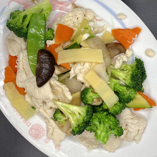 LOW FAT DISH. Slices of chicken breast delicately cooked with mushrooms, snow peas, bamboo shoots, carrots, zucchini, water chestnuts, and broccoli in a light sauce.