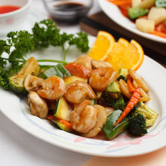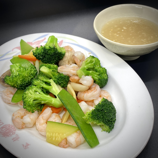 Fresh shrimp delicately cooked with mushrooms, snow peas, bamboo shoots, carrots, water chestnuts, zucchini, and broccoli in a brown sauce.