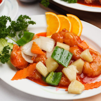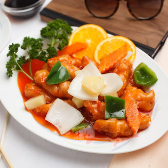 No MSG. Fresh shrimp deep fried with onions, bell peppers, carrots, and pineapple chunks in a sweet and sour sauce.