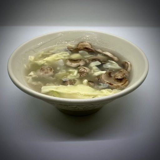 Chicken breast, shrimp, and Chinese vegetables in a chicken broth with fresh scrambled poached eggs.