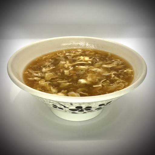 The best soup in the world! Spicy, thick soup made with chicken breast, shrimp, tofu, bamboo shoots, snow peas, and mushrooms with fresh scrambled poached eggs.