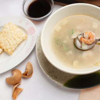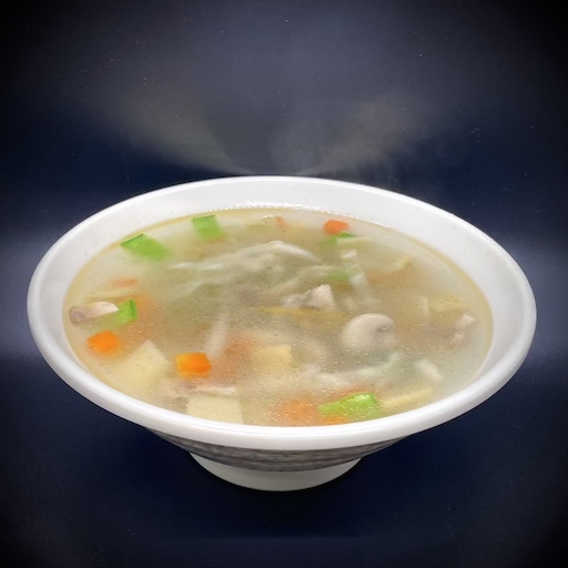 Chicken breast, shrimp, and Chinese vegetables in a chicken broth with sizzling rice.